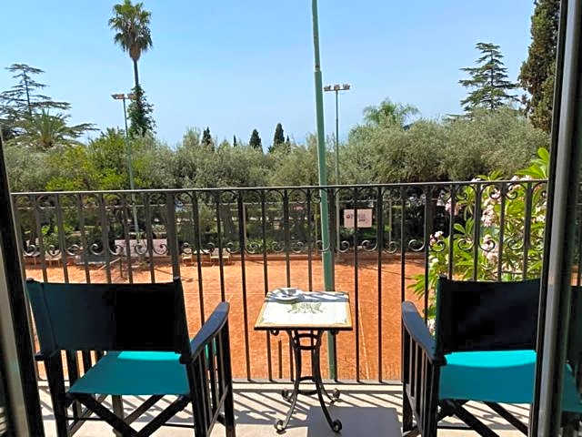 Room with attached bathroom with air conditioning, free Wi-Fi, and satellite TV. The balcony overlooks the Ionian Sea and Mount Etna. It includes a small seating area, terracotta floors, characteristic Sicilian furniture, and a mini-bar.